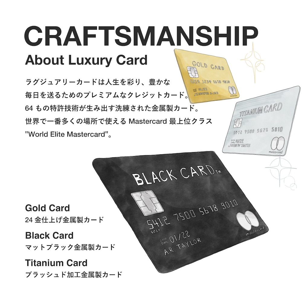 Craftsmanshipは「LUXURY CARD」の最もユニークな特徴の一つである64もの特許技術による金属製というカードの造りを訴求するフィジカルの世界です。各カードの仕様の違いは色だけではありません。ブラックはマット、チタニウムはブラッシュド加工、ゴールドは24金と、テクスチャが異なります。