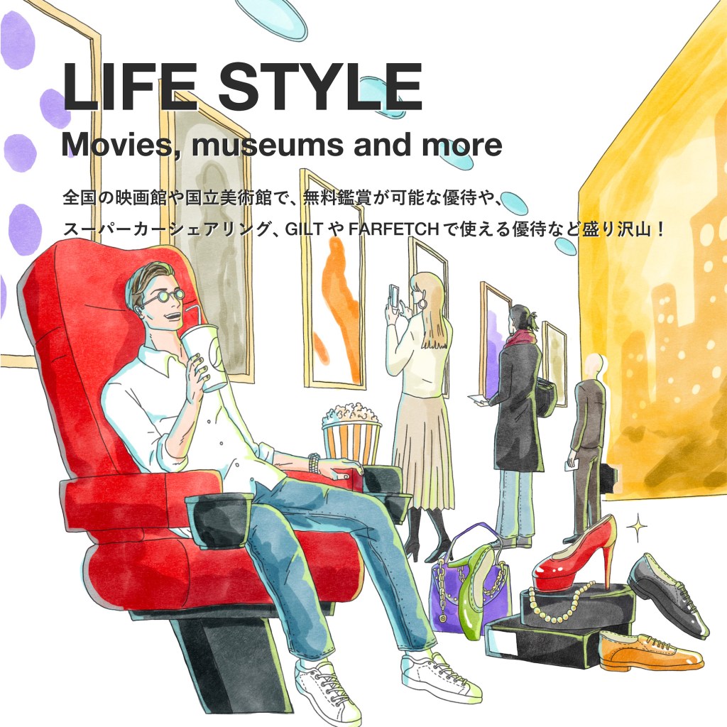 ラグジュアリーカードは他のどこにもない体験をお届けします。LIFE STYLEは、五感を刺激する新たな出会い。「LUXURY CARD」が提供する映画鑑賞やアート鑑賞、スーパーカーシェアリング、オンラインショッピングモールでの優待などといったライフスタイルを彩る盛り沢山なサービスを訴求します。中でも映画鑑賞とアート鑑賞はいつもの日常に新しい刺激を与えてくれます。