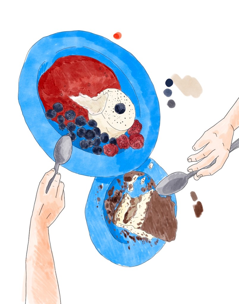 平面ではなく魚眼レンズでのぞいたような湾曲世界を皿で描きました。丸いレンズ越しの世界はまるで迫り来るような印象と視界に飛び込み溢れ出す印象を与えます。クリエイティブポイントはモチーフの質感表現です。クロワッサンの独特の質感は色で表現しました。オレンジジュースがグラスの内側に反射する模様は個人的にお気に入りのポイントです。陶器の皿は独特の質感の表現と美しいブルーが食材を引き立てます。