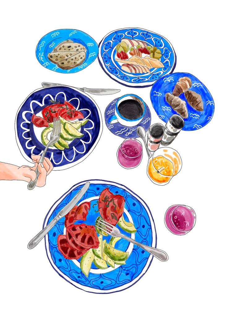 優雅な朝を演出するモーニングプレートはふたりの毎日を彩ります。鮮やかなブルーの上に彩られるオリーブオイルと塩でいただくトマトとアボガドのサラダ、クロワッサン、パン、オレンジとグレープのジュース、フルーツ盛りにコーヒー。ベランダで太陽の光を思いっきり浴びながら、少しずつ目を覚ますと、今日は何をしようか、アボガドをつつきながら想像を膨らませます。