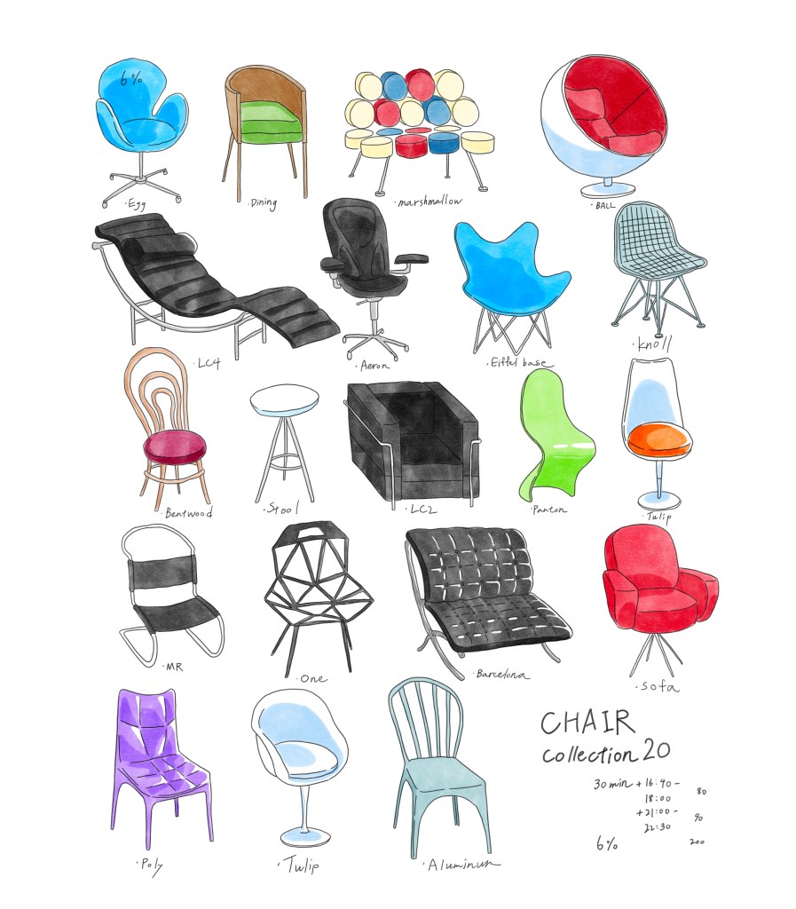 ロイヤルホテルに歴史を持つ北欧代表のリビングチェア「Egg」をはじめ、遊び心溢れる外観にもかかわらず快適な座り心地を実現した「Maeshmallow」、フィンランド発祥で宇宙的空間の演出により数多くのセレブリティを魅了する「Ball」、コルビジェの代表作であり家具史の代名詞とも言える「LC」シリーズ、床から伸びる一本の脚と花弁がまるで一輪の花の如き「Tulip」、初のプラスチック製チェアで快適性と耐久性を兼ね備える不動の名作「Eiffel base」、三角形をモジュールに立体形成された斬新なデザインの「One」、バルセロナ万博でドイツ館に来館するスペイン国王夫妻を迎えるためにデザインされた王の椅子「Barcelona」などなど。