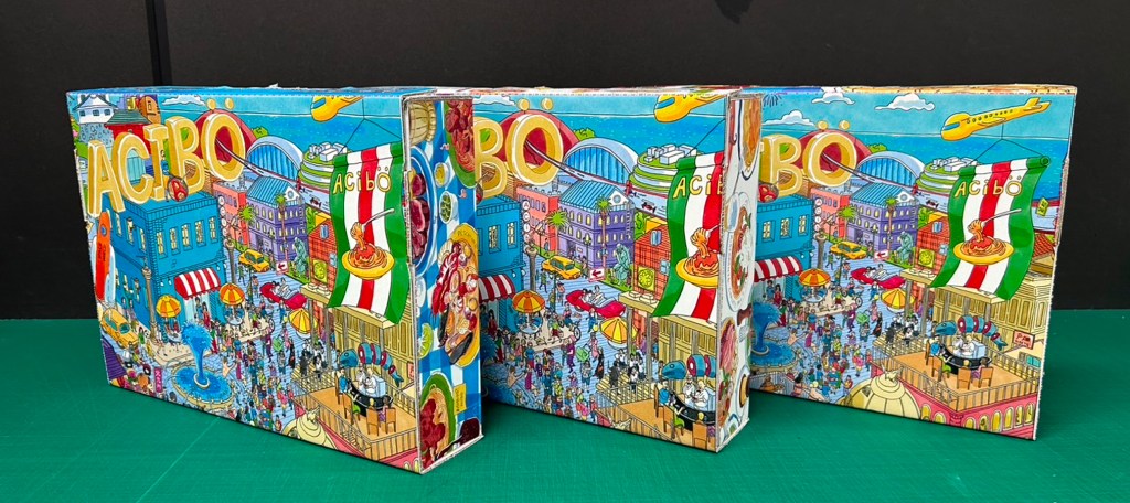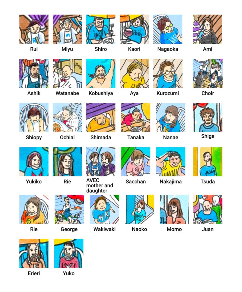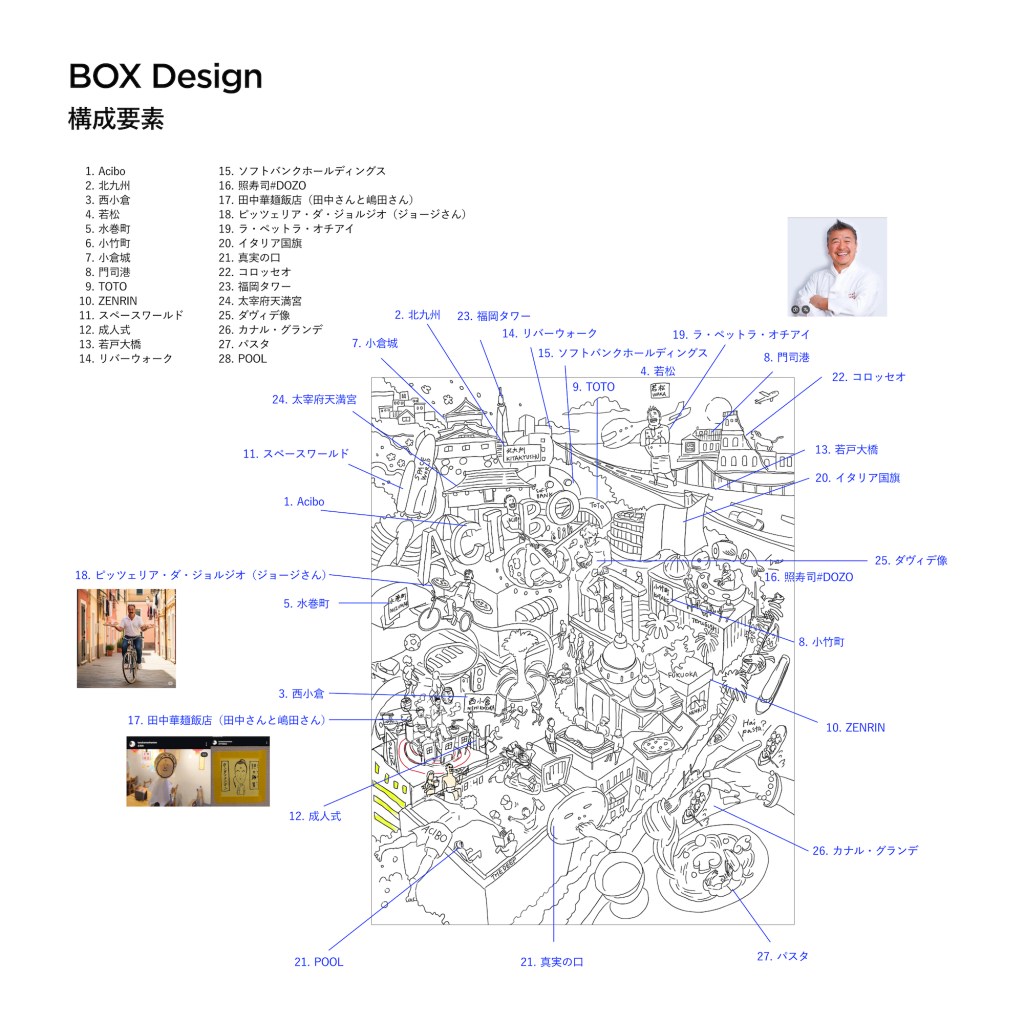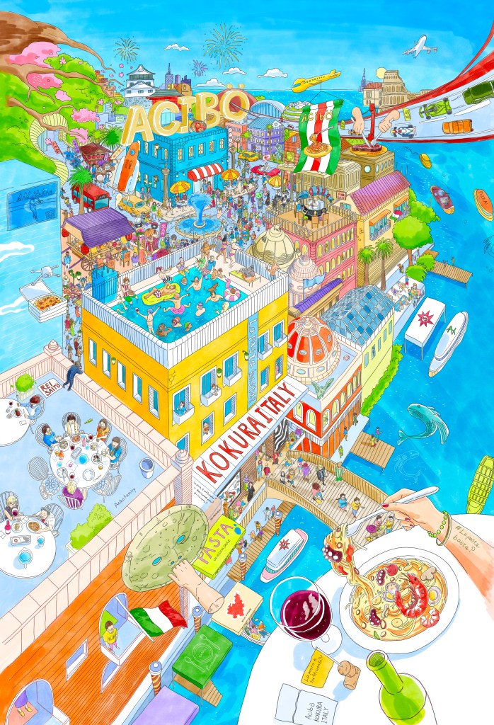 イタリア風景×北九州文化×ウォーリーを探せ をテーマに制作。常連客や仲の良いい飲食店オーナーの友人や知人も盛り込んだ、世界に一つ唯一無二の完全オーダーメイドのクリエイティブ。Aciböワールドの都市俯瞰図。「Aciböというブランドが持つイタリアンの楽しさ・開放感・にぎわい」を、巨大都市=テーマパークの形で象徴化したアート作品。