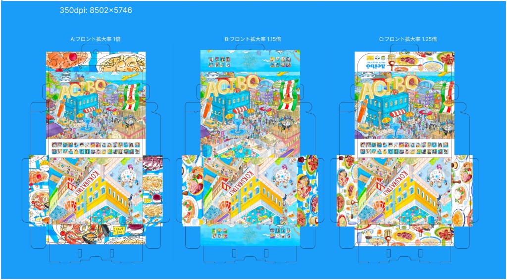 テスト印刷は正面の拡大率、サイドの絵柄違いで3パターンをテスト