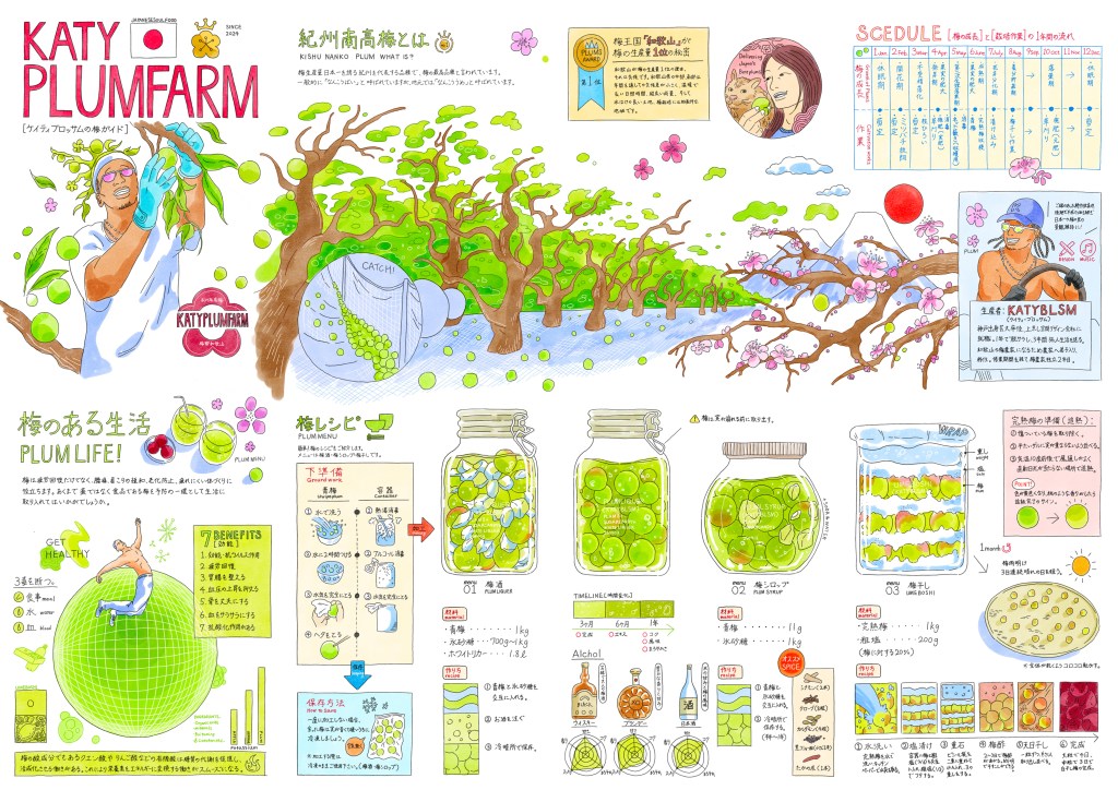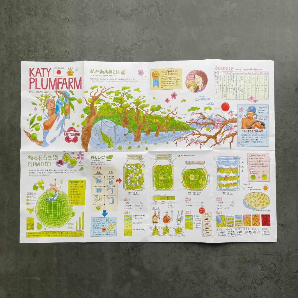 こちらはB3用紙に印刷し、青梅が入った段ボール箱に同梱するガイド。エンドユーザーに正しい保存方法や調理時方法、梅の効能や農園の背景を楽しくインプットしていただくことを目的とした新しい「取扱説明書」です。和歌山の自然に囲まれた「KATY PLUMFARM」での梅の収穫や梅の効能から、梅酒・梅シロップ・干し梅作りといった生活に持ち込めるレシピまでをわかりやすく紹介。四季折々の農園風景や、健康・美容にも嬉しい梅のパワーも満載!見るだけで梅を生活に取り入れたくなるようなアートワークです。